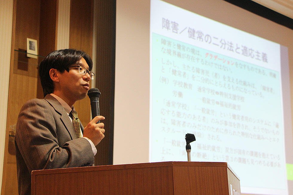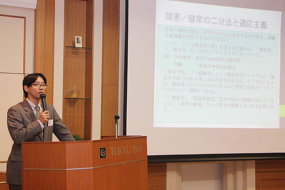 子ども発達学部は、日本福祉大学の中では、教育学や心理学などが中心の学部で、2013年、心理臨床学科の中に障害児心理専修が開設されました。特別支援学校教諭の養成課程もこの学科に置いていて、私も主に特別支援学校の教職課程関係の科目を担当しています。私は大学を卒業後、特別支援学校の教員を9年ほど勤め、その後、大学院に行き今の仕事に至ったという経過があります。博士課程では障害者の卒業後の就労について研究しましたので、今日はその内容をベースにお話しします。