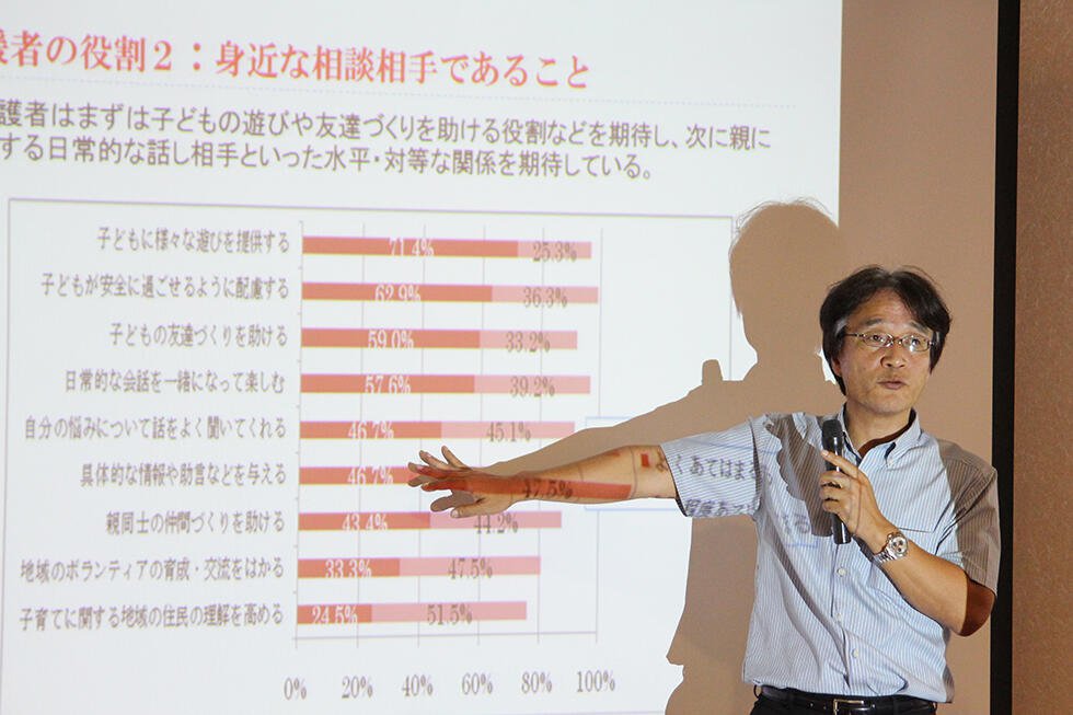支援者の役割の1番目は、拠点に来る親御さんたちは期待と同時に不安を抱えてやってくるので、温かく迎え入れ、評価することです。2番目は、身近な相談相手であることです。3番目は、利用者同士をつなぐことです。親同士の支え合いを「ピア・サポート」と呼んでいますが、仲間を得ることによって、みんな問題を抱えながらも一生懸命頑張っていると気付く、それだけでも人は支えられるのです。4番目は、地域のいろいろなボランティアを使って利用者と地域のつながりをつくっていくことです。最後は、アウトリーチ、支援者自らが地域のさまざまな機関に出向いて、自分から利用者になりそうな人とつながっていくことです。