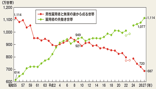 男性が働いて女性が家庭にいるという形は大正時代に始まり、それが一般的になったのは高度成長期の1955~70年ごろです。ところが、1980~90年の10年間で専業主婦は大幅に減り、その分、共働き世帯が増えました。そして、2000年以降は共働き世帯中心の社会になっています。現在は若年層の給与水準があまり高くないため、共働き世帯が増える傾向は今後も続くと思われます。