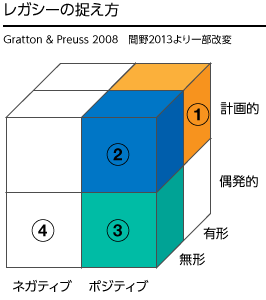 「レガシー」とは「遺産」です。パラリンピックが来ることで何が残るか。ネガティブかポジティブか、無形か有形か、計画的か偶発的かという三つの軸で分類してみました。