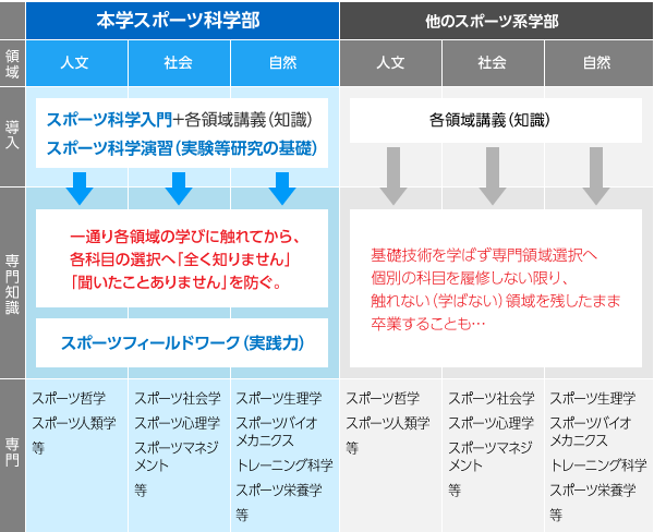 コンセプトは、「スポーツを360度科学する」です。強くなるためのトレーニング科学から、健康づくりのための健康科学スポーツと政治・経済、スポーツを普及するためのマネジメント、指導や強くなるための心理学まで、スポーツに関わる全ての視角から勉強できる学部です。講義とフィールドワークにより、子どもから高齢者まで、障害のある人も含めた全ての人に対応できるスポーツ指導力を身に付け、どんな仕事でも生かせる実践力を鍛えます。