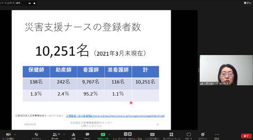 日本福祉大学看護実践研究センターでは、多職種連携に焦点をあてたシンポジウムを毎年開催しています。今年度は、「災害時の多職種構成チーム間の連携」と題したシンポジウムを「Zoom」を用いてオンラインで開催し、関係者含めて全国各地から110名の方にご参加いただきました。