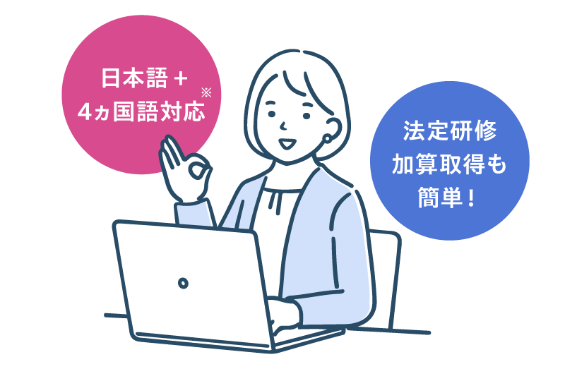 E-ラーニングシステムを用いたオンライン研修動画で、日本人・外国人職員の研修実施が可能!動画時間は100時間以上!法定研修を全て網羅するとともに、新人~管理者までの階層別研修も充実!さらに、外国人職員向けに、日本の文化‧ルールを学べる生活支援動画や介護技術等の教育動画も配信!進捗管理機能や、研修資料‧テストも搭載で報告もラクラク!