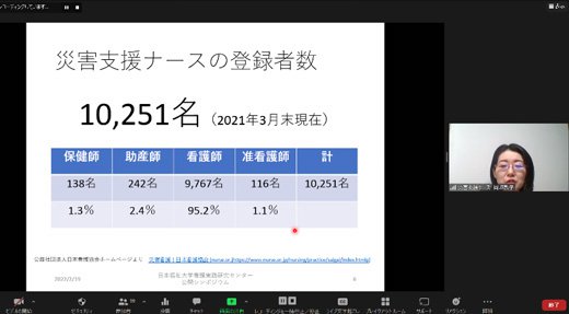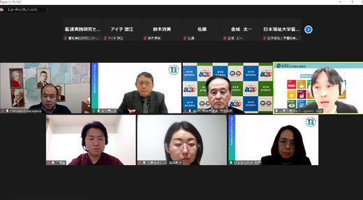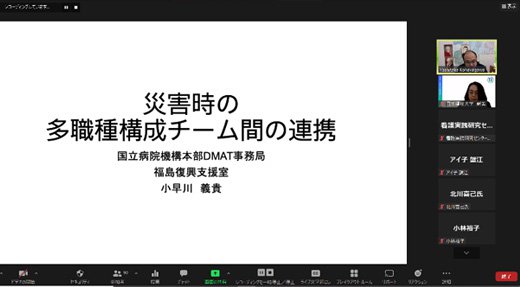 日本福祉大学看護実践研究センターでは、多職種連携に焦点をあてたシンポジウムを毎年開催しています。今年度は、「災害時の多職種構成チーム間の連携」と題したシンポジウムを「Zoom」を用いてオンラインで開催し、関係者含めて全国各地から110名の方にご参加いただきました。