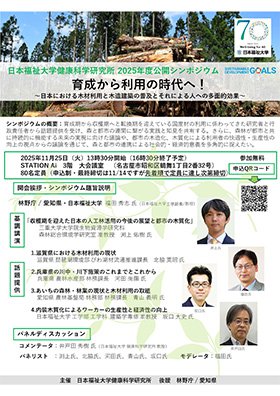 健康科学研究所主催、ウェルビーイング工学研究センター共催、林野庁・愛知県後援 2025年度公開シンポジウム「育成から利用の時代へ!」を開催します