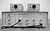 システムは, Macintosh (Power Macintosh 9500:144MB メモリ, 1GBHDD, 4 倍速 CD, 内蔵 JazDrive) に, 心拍数計測用のバイオアンプ, および AD 変換器を外部接続したもので, 有線方式により心拍数を計測するものである. AD 変換器は, MacLab/8 ((株) AD Instruments) を, 心拍数計測用には, 同 AD 変換器に接続できるバイオアンプ (Bio Amp: (株) AD Instruments) を用いた. (図 1) である. MacLab/8 では, 同時に 8 チャンネル分のアナログデータを取り込み, 処理することができる. また, アナログ出力用に 2 チャンネル使用できる.