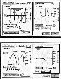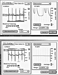 以上は安静時の場合であるが, 運動中はさらに基線の動揺が生じる. これは, 呼吸運動による胸郭の変化, 体幹の捻転等からくる極間抵抗の変化, あるいは, コードの揺れ等による電極の揺れが原因のノイズ, 他による. 図 4 は体幹をゆっくりと捻転させた場合の基線の動揺を示している. 上下段とも左側のグラフで, 心拍数波形の基線が波打つように動揺しているのはこのためである. この場合も, offset レベルを調整することで, 心拍数計測の正確性を増すことができる. 右側の瞬時心拍数のグラフで, 下段の方が安定しているのはこのためである. その他, 時定数 0.03 で low pass フィルター (低周波数成分をカットするフィルター) をかけた.
