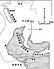◇伊勢湾断層: ―敦賀湾−伊勢湾構造線は甲楽城断層からSEへと延び, 伊吹山の山麓をめぐって, 関が原を通り, 養老断層へと続く. そして, 濃尾平野の西縁を通って, 名古屋港から伊勢湾に入り, 伊勢湾断層となる. さらに, 南方へ延び, その後, 伊勢湾口を経て, 太平洋へ抜けるとされた. この構造線は, それに沿って越前海岸や養老山脈のような顕著な地形的特徴が見られるだけではない. 『それは渥美半島から志摩半島にかけてほぼ東西に延びる日本列島基盤の地質構造を横切って, それをずらせている』 と指摘されてきた. 地形的にみても, また, 基盤構造からみても, これだけ明瞭な特徴をもった構造線はきっと大きな意味をもつであろうと考えられてきた. 何時頃できたのであろうか. 今でも活動的であろうか. そして, 近い将来, それは活動するであろうか.