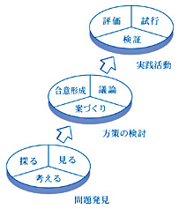 環境学習の概念を広義にとらえると, たとえば, リサイクル活動や地域づくり活動を通じて, 環境に配慮した暮らし方や自然とのつきあいを模索し, 実践していく側面, 豊かな自然の中で心身のリフレッシュを図り, その恵みを享受する側面などを含む総合的な枠組みとしてとらえることができる. そして, この環境学習活動を通じて, 問題の発見, よりよい地域環境実現に向けての代替案の提起, 実践活動を通じた評価などのプロセスを踏みながら, 地域環境づくりへの主体的な参加を実現していくこととなる. このプロセスは一方通行の流れではなく, つねにフィードバックの構造を内包している.