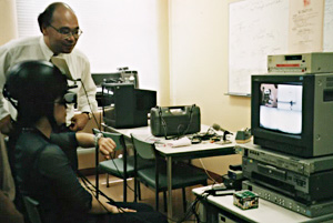 そこで目の回転がこのような場合どのくらい生じるのかを調査するのが今回の実験の狙いです. この計測をするため, 両目の動きを 2 台の赤外線カメラで撮影を行います. この撮影のためテレビカメラをヘッドマウントディスプレイと目のすきまに取り付けた特殊な装置を作成し, 計測に使用しました. ここで得られた映像はコンピュータ画像解析で詳細に調べられます.