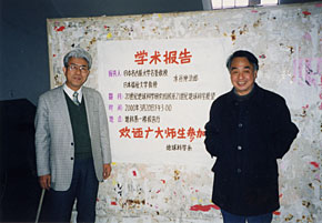 左 水谷伸治郎所長 右 廬華復南京大学教授 講演案内板の前で |