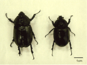 1:1-10%, 2:10-20%, 3:20-30,..., 10:90-100%, +:1%未満 *は落葉広葉樹, **は常緑広葉樹, ×は針葉樹を指す ![]() 写真−6 管理された雑木林で 採集されたカブトムシ