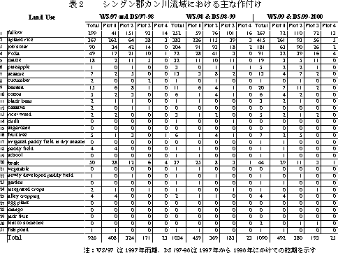 表 2 は, プロットごとの代表的な作付け品種のみを整理したものであるが, その他にも, 換金作物が導入され始めており, 従来の焼畑による陸稲生産だけに依存した農業が徐々に変化し始めていることがうかがえる.