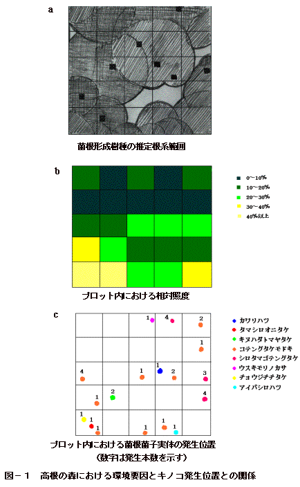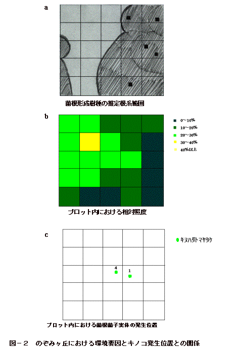 高根の森のように太陽光が林床によく当たる環境では,温度が上昇し,土壌中の水分を蒸発させ,有機物の分解速度も促進されるため,倒木や落葉などの有機物が減少する.こうした環境は,落葉分解菌や木材腐朽菌にとっては生育しにくく,菌根菌にとっては,生育しやすい環境であるといえる.また樹木は,効率的な水分吸収をするために積極的に菌根を形成するのではないかと考えられた.しかし,のぞみヶ丘のように,太陽光が林床にまで到達しにくい環境では,有機物は分解されにくく,また人為的な管理がないことも重なって,有機物が厚く堆積し,土壌は多くの水分を含んでいる.こうした環境では,落葉分解菌や木材腐朽菌にとって生育しやすい環境であるが,菌根菌にとっては,生育しにくい環境であると考えられた. |