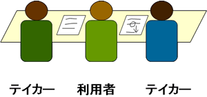 近年、聴覚障害者が高等教育を受ける機会が増加してきており、それに伴い大学の講義においても聴覚障害者への情報保障の配慮が求められるようになってきている。日本福祉大学においても、47名の聴覚障害者が在籍しており、178名のボランティアが、主としてノートテイクにより、聴覚障害者のサポートを行っている(2002年度実績、障害学生支援センターへの登録状況による)。通常ノートテイクでは、1名の聴覚障害学生に対し2名のテイカーが配置され、テイカーが交互に話者(講師)の発言内容を筆記することにより、聴覚障害学生に対し情報を提示する(図1)。したがって、同一の講義を複数の聴覚障害学生が受講する場合には、聴覚障害学生数の2倍のテイカーが必要となることとなり、多くの聴覚障害学生が受講する可能性がある大規模な講義においては、配置できるテイカーが不足し、情報保障を受けられない学生が出てくる可能性がある。