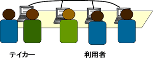 そこで、ノートテイクに変わる情報保障の手段として、パソコンを用いた要約筆記(PCテイク)が用いられることが多くなってきている(図2)。日本福祉大学情報社会科学部においても、PCテイクの効果を検討するために、2002年度よりPCテイクを用いた講義中の情報保障を試験的に行っている。試験実施の結果、PCテイクには、1)1組のテイカーにより複数の聴覚障害者に情報提供が可能、2)テイク速度が速く提示できる情報量が多い、3)テイカーの疲労が少ない、等のメリットがあるが、反面1)文字にしにくい情報の伝達が困難、2)図表等を交えた柔軟な情報提供が不可能、3)誤入力が生じる等のデメリットが存在することが分かった。そこで、PCの画面にスタイラスペンにより直接手書き文字や図等を記入することができるタブレットPCを用いて、上記のPCテイクのデメリットを緩和することを試みた。本報告では、タブレットPCを用いたノートテイクシステムの概要と、開発システムを用いた評価実験の結果について述べる。