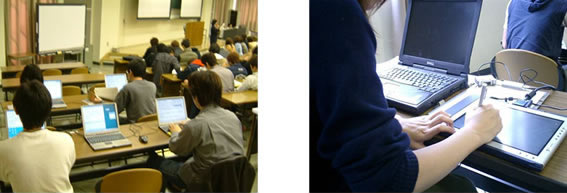 タブレットPCを用いたノートテイクシステムの実効性を検討するために、実際の講義場面での開発システムの評価実験を行った。評価実験には、日常的にPCテイク(通常のPCテイク)によって講義を受講している聴覚障害学生と、PCテイクによる情報保障の豊富な経験を有するテイカーが参加した。評価実験は、聴覚障害学生が履修している講義において行われた(図5)。