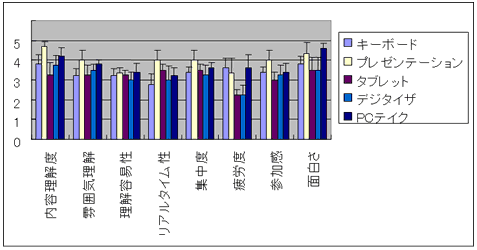 図7に評価実験の結果を示す。講義の内容および雰囲気に対する理解度に関する評定では、「プレゼンテーション」が最も高く、ついで「PCテイク」の評価が高くなった。「キーボード」に対する評価は通常のPCテイクに対するものよりも低くかった。「プレゼンテーション」に対する高い評価は、講師が指し示す資料上に、講義の進行と同期して情報が書き加えられるため、情報提示のリアルタイム性が高く、また、その他のテイク方法の場合には、講師の発話内容をテイクした画面と、前方のスクリーンに提示されるプレゼンテーション資料の両方を見なければならないのに対し、「プレゼンテーション」のテイク方式では、その双方の情報を単一のモニタで認識可能であるため、集中して講義に臨むことが出来るためであると考えられる(実際に、リアルタイム性および集中の容易さに関する評定項目でも「プレゼンテーション」は高い評価を得ている)。それに対し、「キーボード」に対する評価が低くなった理由としては、通常のPCテイクでは2人のテイカーが交互に、または同時にキーボード入力することにより情報提示するのに対し、「キーボード」方式では一人が主入力(キーボード入力)、一人が補助入力(手書き入力)を担当しており、一人で担当するキーボード入力が遅れてしまった可能性が考えられる。そのため情報提示のリアルタイム性が低下してしまい(実際、「キーボード」のリアルタイム性に対する評価は最も低い)、講義内容の理解が困難になってしまったのであろう。今後、主入力二人+補助入力一人の体制でのテイク評価を行い、「キーボード」方式での効率的なテイクのあり方について検討を進める必要がある。また、「PCテイク」に対しては全般に比較的高い評価が得られている。このことに関しては、聴覚障害学生、テイカーとも、日常的な通常のPCテイクによる情報保障の経験を有しており、テイク方式に対する習熟により評価が引き上げられた可能性が考えられる。
