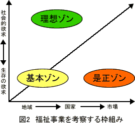 図2の縦軸は生存的欲求から社会的欲求まで,「生存の権利」のベーシックなニーズから,「自己実現の欲求」の継続的なニーズ,さらに「生活質の保障」などのニーズを表れ,横軸以上ニーズに満たす福祉サービスを提供する担い手を表れ,中の斜線は正常分布と表れている.