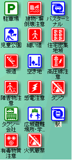 今回のシステムでは,災害用に各種160種類のランドマークをアイコン化して,分類は,危険な建物,危険な場所,備蓄場所,公共施設,避難場所等を作成し利用した.アイコンは長岡造形大学の平井研究室,澤田研究室が監修した防災・防犯マップづくり用シェイプ集を活用した.