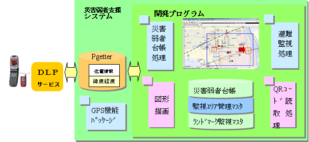 本研究で開発したシステムの基本構成は,平時に登録した災害弱者台帳などを前提に災害弱者・見守りネットワークへの安否確認や避難指示などを発出する一斉同報メールシステムと,危険エリアへ接近した場合や避難時間がかかり過ぎた場合などに,位置情報を本部で監視することにより,避難支援指示を行う位置情報監視システムである.