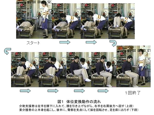 要介護者を仰臥位から座位へ変換する体位変換動作を連続的に行った際の,上肢,体幹および下肢における筋放電量ならびに関節角度を解析した.上肢筋は,体幹筋肉に比べて筋放電量が多く,体位変換動作において重要な役割を果たしていることが明らかとなった.動作の主要局面である,上半身の引き上げ局面では,体幹と大腿のなす角度が有意な変化(p < 0.05)を示したが,膝関節角度の変化はみられなかった.体位変換を10回繰り返した直後の心拍数は,安静値に比べて有意に高かった(p < 0.05).本研究で行った,体位変換を10回繰り返す動作は,介護動作における上肢,体幹などの筋持久力を高めるのに有用であり,また,数セット繰り返すことで,持久的なトレーニングとしても活用できることが示唆された.