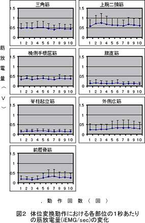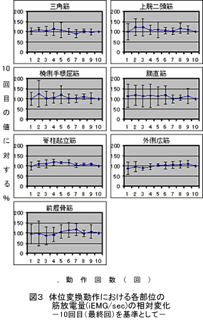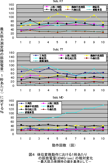 max比).また,運動習慣のないKTは,3回目を過ぎたころから,上腕二頭筋と橈側手根屈筋の筋放電量が漸増する傾向を示し,上肢の筋肉が疲労状態にあることが推察される.同被験者における三角筋の最大筋力は再測定するする予定であるが,おそらく同様な傾向が見られるものと思われる.これらの図4の結果から,日頃からトレーニングを行って,筋力ならびに筋持久力を強化しておくことが,本研究で用いたような介護動作を連続して行う際には有効であることが示唆された.