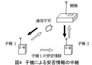 災害状況によっては子機→親機の通信が困難になる場合がある.親機は他の子機を介して,通信が困難な子機の安否情報を受信することができる(図4).