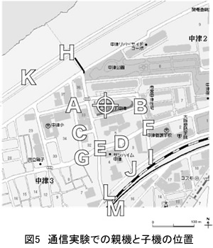 表1は親機−子機間の通信実験結果である.比較的電波の障害物が少ない所では200m以上の距離でも通信できた.建築物の谷間など込み入っているなど,通信状況の悪い場所に子機がある場合には送受信に失敗している.双方向で子機中継が可能なアルゴリズムを考案することで,子機が倒壊した建物の中にある場合にでも通信できる強固なシステムの開発が今後の課題である.
