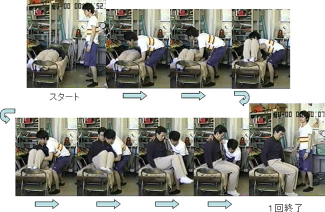 保存した筋電信号を全波整流して積分し, 筋電積分値を求めた. 積分区間は, 体位変換動作では上腕二頭筋の放電が始まる時点から, 膝を支えていた左腕が身体から離れるまでとした. 車いす移乗動作では, VTR 映像を確認し, 座位の対象者を上方に引き上げる準備が整った時点を動作開始時点とした. また, 車いすに要介助者を座らせて被験者が姿勢を元に戻す直前の時点を動作終了時点として定めた. これらの映像と筋電図波形の同期は, 動作開始前に発光ダイオードを光らせ, その光をデジタルビデオカメラで写し, 同時にスイッチ ON 時の電圧変化を前述の A/D 変換装置に筋電図波形と取り込むことで行った. なお, 筋放電量の解析に際しては, 被験者間の動作時間の違いや複合的な動作であることを考慮し, 1 秒あたりの積分値 (iEMG/sec) として算出した. 体位変換時の体幹−大腿角度ならびに膝関節角度は, 被験者の体位変換動作を左側方から撮影した VTR 映像から, 上半身の引き上げ局面について分析した (図 1, 2).